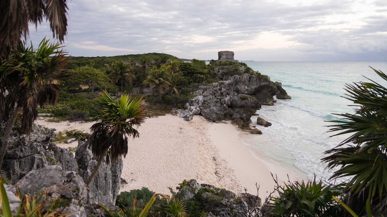 Die Ruinen von Tulum kennt wahrscheinlich jeder, der schon einmal einen Reiseprospekt der Gegend in der Hand hielt. Das „Castillo“ thront auf der Klippe, hoch über dem hellen Strand und dem kristallblauen Wasser der Karibik. Wir erkunden die Ruinen noch im halbdunkeln und ganz alleine. Später kommen wir hier nur noch mit Einsatz der Ellenbogen zu dem postkarten-würdigen Foto.