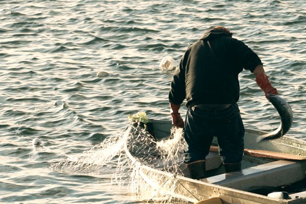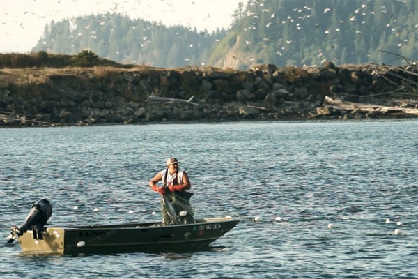 Zu dieser Jahreszeit wandern die Lachse vom Meer die Flüsse aufwärts zu ihren Brutplätzen, wo sie schliesslich vor Erschöpfung sterben. Der ideale Zeitpunkt für die Fischer, um daraus Profit zu schlagen. Doch nicht mit Angel und Köder. Verschiedene kleine Ruderbote sind bei der Flussmündung im Meer in Rufdistanz zum Ufer im Wasser verteilt. Auf jedem steht ein stolzer Fischer davon die meisten "Natives". Jedes Boot ist umgeben von einer Reihe weisser Bojen. Und prompt zappelt es im Wasser. Am Netz entlang zieht sich der Angler zur gegebenen Stelle, holt den Fisch ins Boot und befreit ihn vom Netz, während es an einer anderen Stelle im Wasser wieder zappelt und das ganze Spiel von vorne beginnt. Gleichzeitig ist es auch ein Katz und Maus Spiel mit einer Robbe, die ums Netz schwimmt und sich die leichte Beute nicht entgehen lassen will. Nach einer gewissen Zeit haben die Fischer so viele Lachse ins Boot geholt, dass wir sie nicht mehr zählen können.